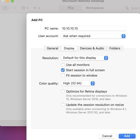 PC name에 접속하려는 원격 PC의 IP주소를 입력하고 접속을 시도합니다. 윈도 원격 접속과 마찬가지로 접속 시 디스플레이 옵션과 오디오 옵션을 선택하여 접속할 수 있으니 참고하시기 바랍니다.