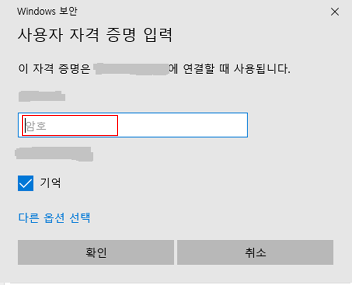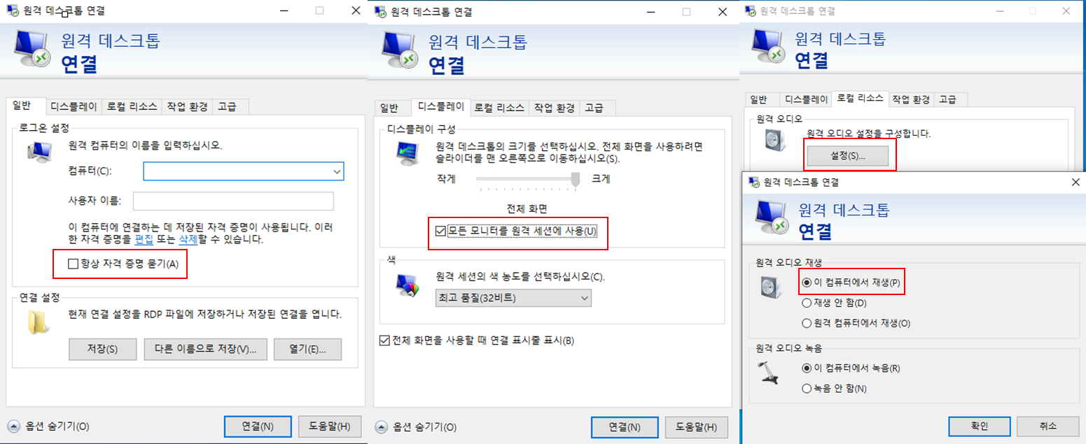 (1) 항상 자격 증명 묻기 옵션은 원격 PC로의 접속 시 자격증명을 항상 묻는 메뉴가 나오게 하는 메뉴이고 보안에 취약하지 않은 PC에서 접속 중이라면 이 체크박스는 공란으로 두시는 게 추후 접속할 때에도 편리합니다.