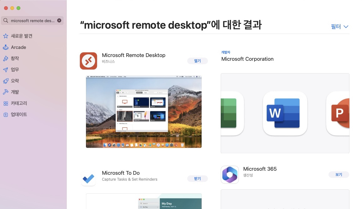 이번엔 맥북에서 원격 설정된 PC로의 접근 방법을 알아보도록 하겠습니다. Window 운영체제와는 다른 Mac 운영체제이기 때문에 윈도와는 다른 어플이 필요합니다. 아래와 같이 앱스토어에서 "microsoft remote desktop" 어플을 다운로드합니다.