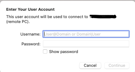 접속 옵션 설정 후 “Add” 선택 시 아래와 같이 사용 중인 username과 비밀번호 입력 후 원격 PC에 접속 가능합니다.